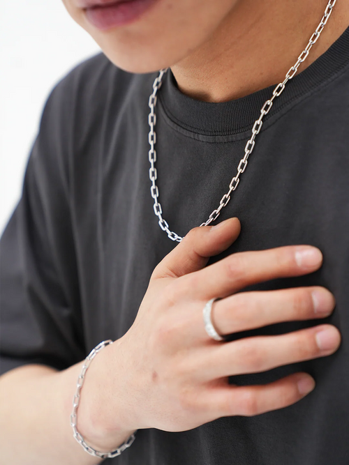 磨き上げられたシルバーは、首元で滑らかに光を反射し、シンプルながらも確かな存在感を演出。